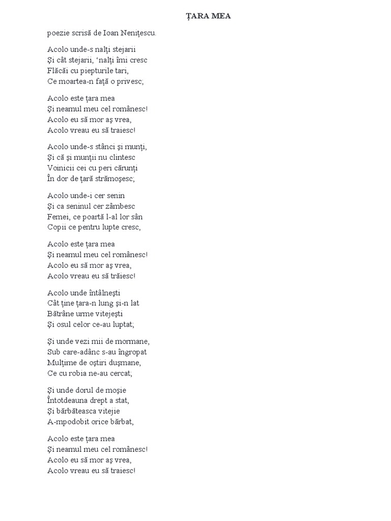 Au fost şi sunt momente emoţionante când într u. Acolo eu să mor aş vrea acolo vreau eu să trăiesc. Acolo unde întâlneşti cât ţine ţara n lung şi n lat bătrâne urme vitejeşti şi osul celor ce au luptat. Acolo unde i cer senin şi ca seninul cer zâmbesc femei ce poartă l al lor sân copii ce pentru lupte cresc acolo este ţara mea şi neamul meu cel românesc.