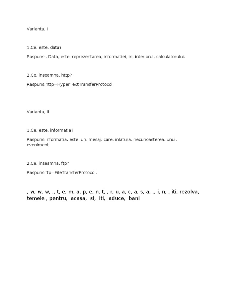 Inform a ție sf at. Un program de calculator este format dintr un șir de instrucțiuni alese dintr un set predefinit de instrucțiuni numit limbaj de programare prin care se comunică unui calculator în mod detaliat care anume operații și în ce ordine trebuie să efectueze când sunt scrise de oameni de obicei de către programatori specializați șirul de instrucțiuni se numește cod. Informaţia este produsul cheie comercializat în aproape fiecare categorie de site web care poate fi găsită pe internet ca de exemplu. Odobescu s ii 183 v.