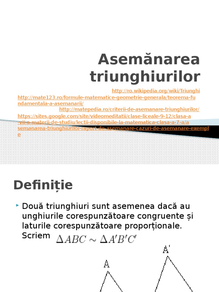 Elevii să recunoască criteriile de asemănare a triunghiurilor. Observația 3 relația de asemănare este o relație de echivalență pe mulțimea triunghiurilor din plan. Vezi și lecția triunghiuri asemenea. Doua triunghiuri sunt asemenea daca unghiurile corespondente sunt congruente si laturile corespondente sunt proportionale.