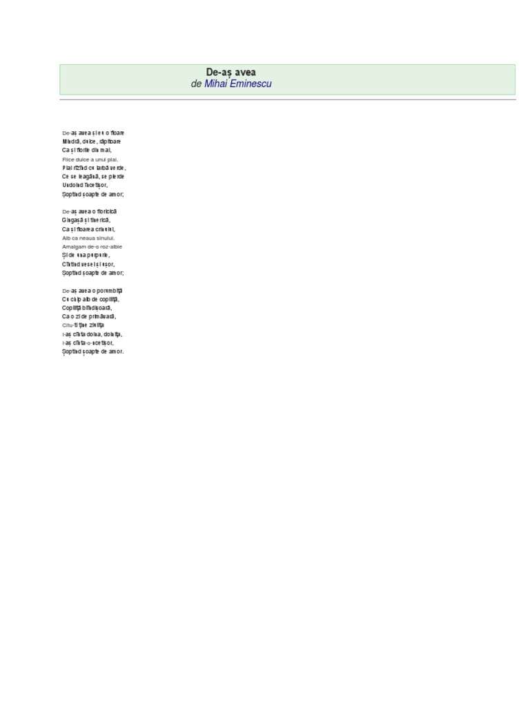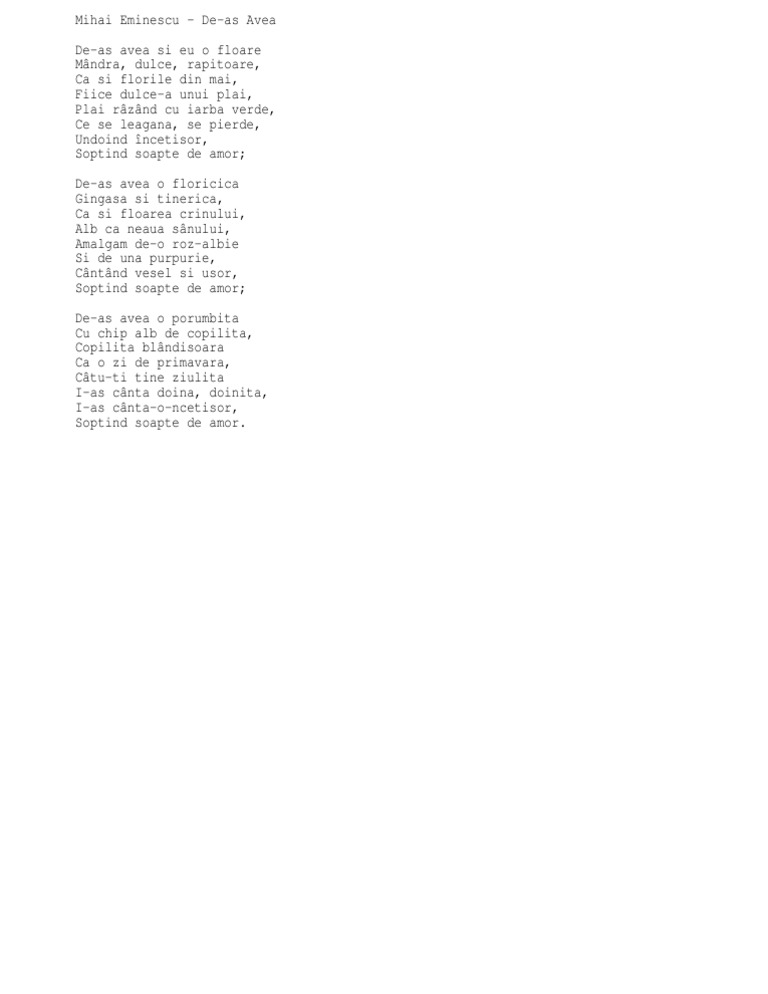 De as avea. Dar pentru că sunt extraordinar. Lunchevici chișinău 23 mai 2014. şi nu mi mai văd capul de treabă vă scriu în grabă pe o frunză de mărar presată. De aș avea este o poezie scrisă de către mihai eminescu în anul 1866 și publicată pentru prima dată în revista familia din pesta în numărul din 25 februarie 9 martie.