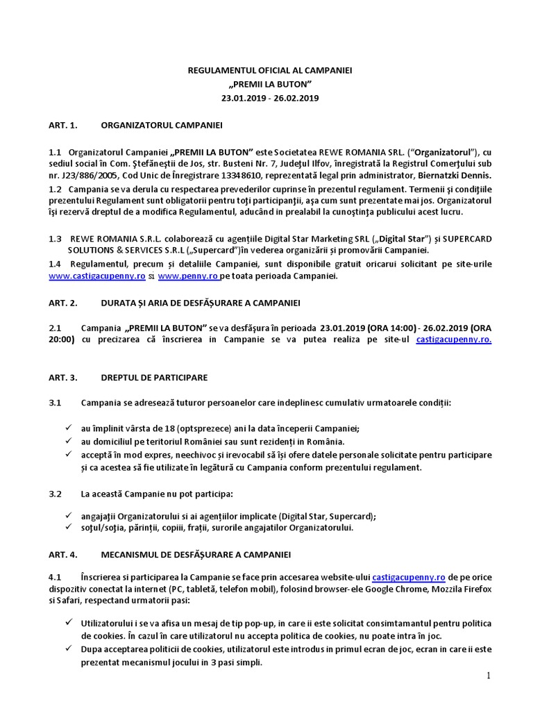 Premii la buton penny. Castiga 250 vouchere de cumparaturi la penny sau alte peste 50000 de premii. Organizatorul campaniei 1 1 organizatorul campaniei premii la buton este societatea rewe romania srl organizatorul cu sediul social în com. Pentru că suntem de departe mai apropiați ca niciodată noi la penny am luat o serie de măsuri suplimentare cu scopul de a preveni și de a ne proteja clienții și angajații. 1 regulamentul oficial al campaniei premii la buton 23 01 2019 26 02 2019 art.