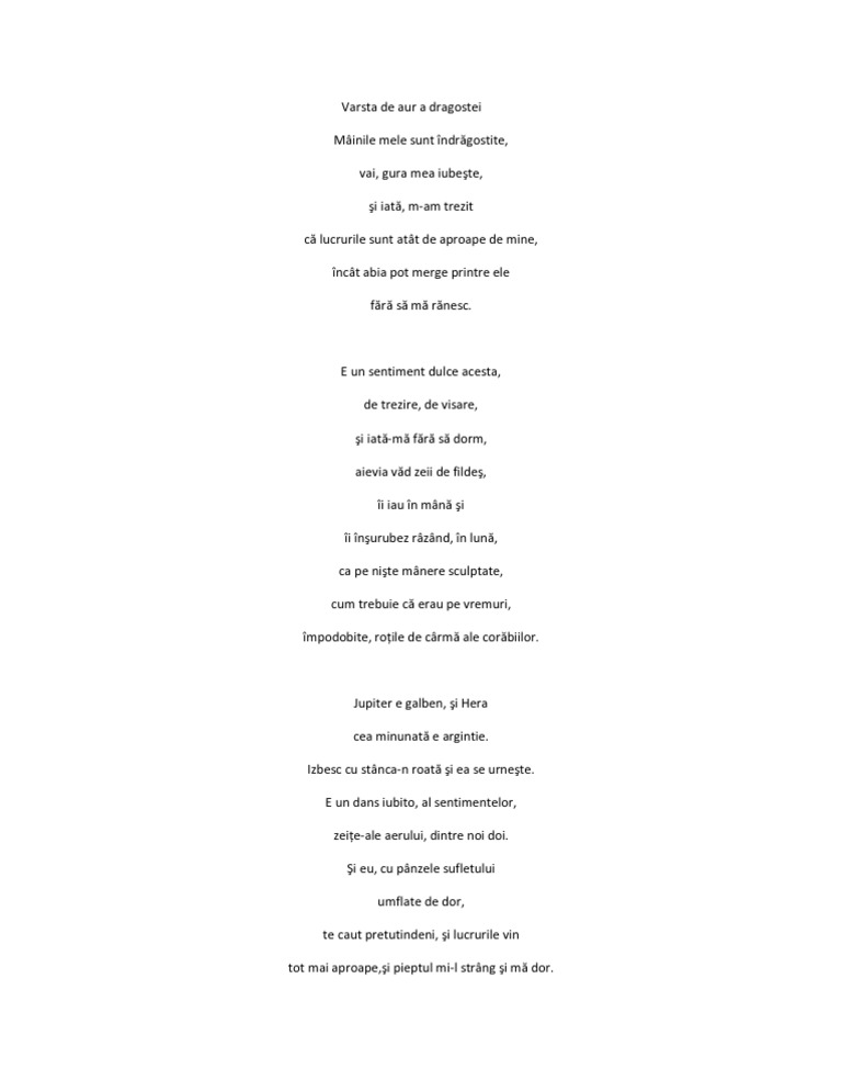 Vârsta de aur a dragostei mâinile mele sunt îndrăgostite vai gura mea iubeşte şi iată m am trezit că lucrurile sunt atât de aproape de mine încât abia pot merge printre ele fără să mă rănesc. Vârsta de aur a dragostei mâinile mele sunt îndrăgostite vai gura mea iubeşte şi iată m am trezit că lucrurile sunt atât de aproape de mine încât abia pot merge printre ele fără să mă rănesc. E un sentiment dulce acesta de trezire de visare şi iată mă fără să dorm aievia văd zeii de fildeş îi iau în mână şi.